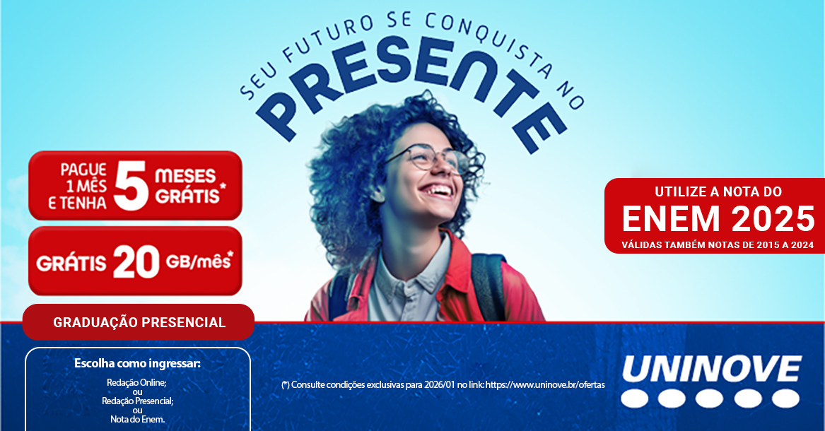 Informações adicionais sobre a presente oferta: (i) o valor da parcela publicada no site corresponde ao curso ofertado pela UNINOVE para ingressantes/calouros matriculados no 1º semestre acadêmico do curso, no 1º SEMESTRE LETIVO (CIVIL) DE 2026; (ii) o valor da parcela publicado no site da UNINOVE corresponde à condição especial e exclusiva para o 1º SEMESTRE LETIVO (CIVIL) DE 2026; (III) a oferta de isenção das parcelas será válida exclusivamente para o 1º SEMESTRE LETIVO (CIVIL) DE 2026, de modo que a partir do 2º semestre letivo (civil) de 2026 o aluno pagará a rematrícula (primeira parcela) e as outras 5 (cinco) parcelas sucessivas que compõem o semestre; (IV) sobre o valor de cada parcela não incidirá qualquer outro desconto concedido pela UNINOVE em decorrência de parcerias; (V) a formalização da matrícula está condicionada ao pagamento da 1ª parcela referente à matricula e está sujeita à formação de turma e confirmação de vaga no curso, período e campus escolhidos; (VI) o aluno, no ato da matrícula, tomará conhecimento do valor efetivamente contratado, correspondente ao valor integral de cada parcela que compõe o semestre.